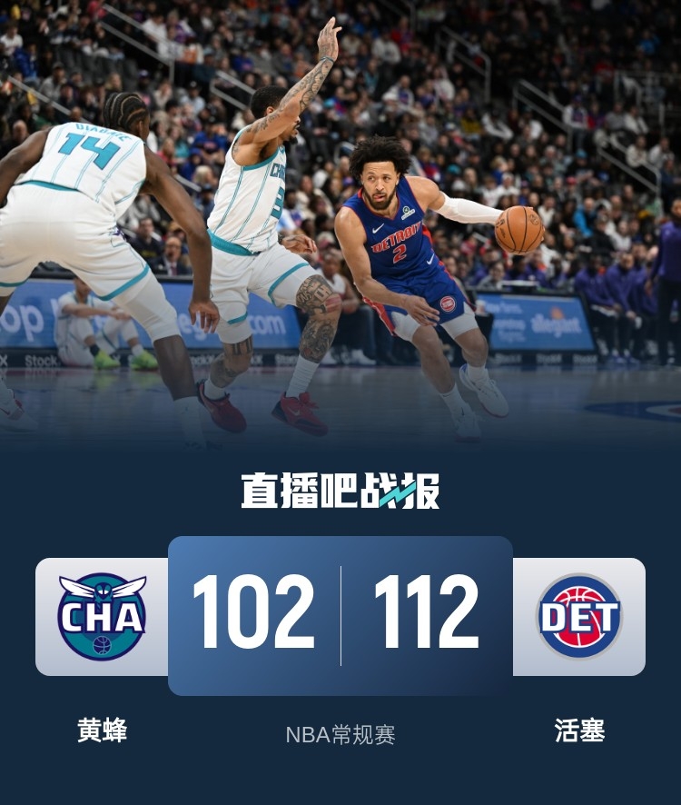 上半场,活塞率先发力,哈里斯和比斯利联手10投10中轰下25分,帮助球队首节便取得24分优势,次节赛斯-库里三分3连击苦苦支撑,半场战罢活塞66-46领先黄蜂。下半场,双方围绕20分的分差展开拉锯战,活塞稳扎稳打保持优势,末节黄蜂奋力反击一度追到只差2分,活塞及时回暖轰出17-3杀死比赛。最终,活塞112-102击败黄蜂,主场过关。