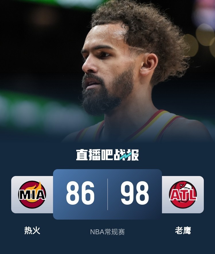 比赛开始,双方上来比较慢热,维金斯三分率先开和,老鹰则是全民皆兵,比分始终胶着,首节老鹰仅领先1分,次节维金斯又是接连三分命中,包揽球队上半场的三分,队友始终不开和,特雷-杨接连送助攻,老鹰半场领先到8分。下半场,希罗三分始终不开,奥孔武里突外投带领老鹰一度领先到双位数,李凯尔和邓罗终于三分开和,热火8-0追分,但老鹰三节还领先8分,末节维金斯强打2+1,伯克斯终于开三分,热火8-0继续追分,勒韦尔成为奇兵得分上双给出回应,老鹰始终守住两球以上领先,最终老鹰98-86力克热火,终止3连败。
