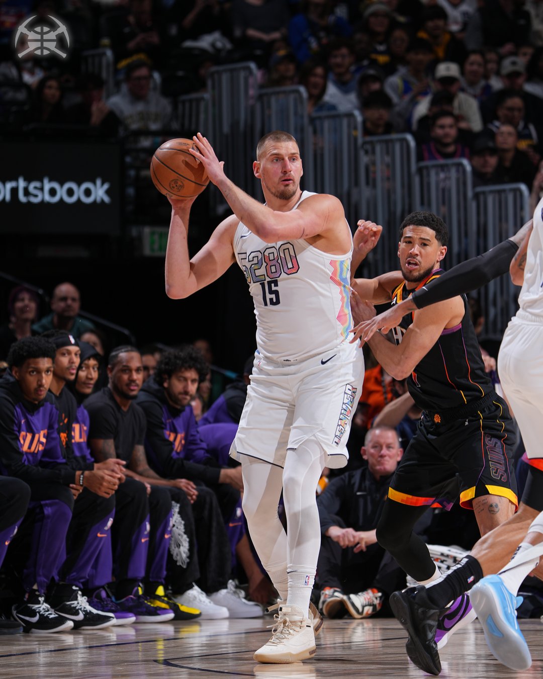 比赛如同一场漫长的博弈,太阳的三巨头用天赋与速度掀起风暴,布克的犀利突破、杜兰特的致命三分,像刀刃般试图撕裂掘金的防线。然而约基奇是时间的雕刻者——他让分秒在指尖流淌成诗。三节未过,他已悄然刻下17分12篮板15助攻的初稿,如魔术师般将皮球织成一张网,每一个传球都是精密计算的几何题,戈登的外线开花、小波特的空切暴扣,皆是他笔下的标点符号。