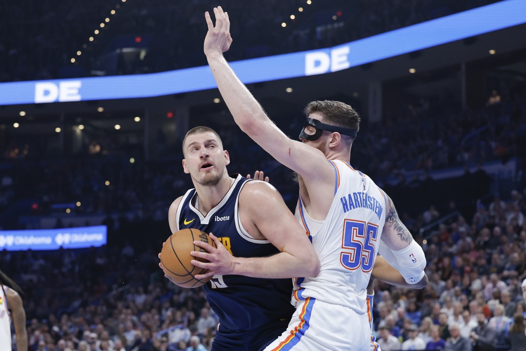 雷霆防守的底层逻辑是哈尔滕施泰因当肉盾正面扛约老师,其他人帮忙夹击轮转,首发阵容优先放空威少、替补阵容优先放空沃特森。戴格诺特教练允许掘金的半射手在三分线外抽奖,局部2-3协防不让约老师舒服地单打强吃——雷霆防守效率联盟第一,小个球员能把轮转速率和防守伸缩性拉满,这是他们制衡约老师的根本底气。