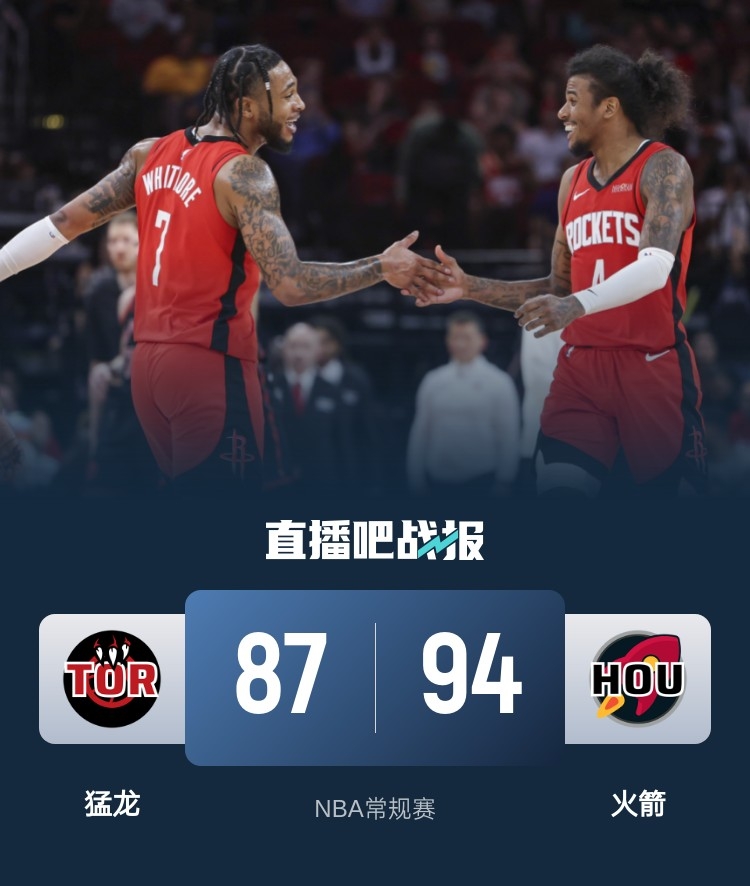 比赛开始,双方进攻端都状态一般,申京开场就腰部不适下场,狄龙连砍10分撑起进攻,奎克利单节上双回应,火箭除狄龙外全队没有进攻状态,首节仅得18分,次节火箭进攻端还是找不到手感,外线频频打铁,好在替补发力一波10-0抹平分差,火箭接连失误被猛龙反击半场还领先5分。下半场,双方命中率有些许回暖,火箭众将接连突破内线,多次送出暴扣咬住比分,但外线始终找不到手感,猛龙总能给出回应守住5分领先,末节杰夫-格林接连罚球加暴扣砍下8分,阿门和白魔接连三分命中,火箭打出19-6攻击波终于反超比分,随后杰伦-格林两记三分领先到双位数,最终火箭94-87力克猛龙,终止6连败同时送对手4连败。