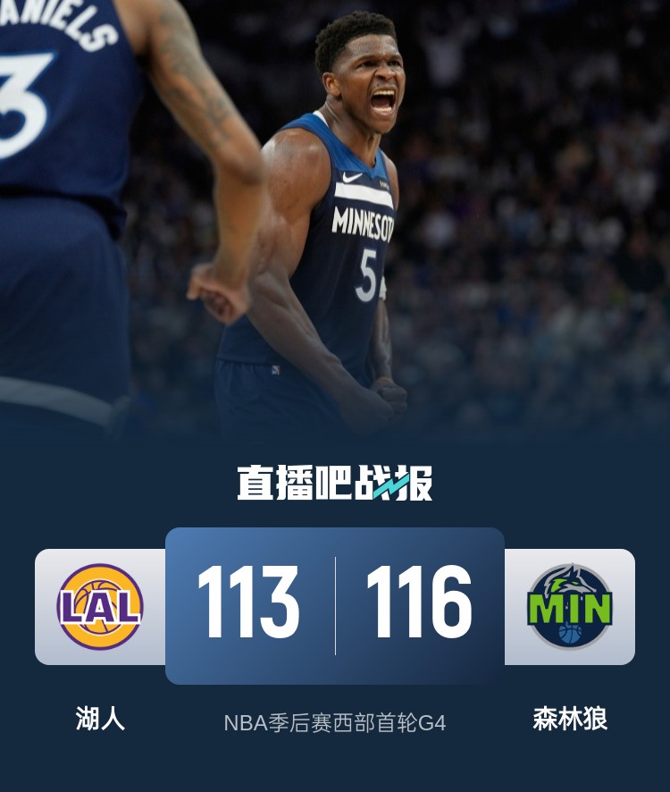 比赛开始,兰德尔连得7分,湖人内外开花给出回应,东契奇高效输出,率队获得两位数优势,爱德华兹连投带罚迅速追赶,次节双方继续缠斗,詹姆斯频频造成杀伤罚球拿分,爱德华兹得分助攻一肩挑,森林狼大举反击打成9-0的攻击波强势反超,半场战罢湖人58-61落后森林狼。易边再战,湖人占得先机,连中三分轰出11-0的攻击波夺回领先,森林狼内外开花顽强咬住,八村塁和里夫斯联手拿分,帮助球队重获两位数优势,末节爱德华兹4分钟砍下11分,里德也连续拿分帮助球队追赶,双方争夺陷入白热化,里德和迪文岑佐联手拿分,湖人2记三分强势回应,关键时刻麦克丹尼尔斯打成2+1,湖人发球失误,爱德华兹运球失误,但森林狼挑战成功改判詹姆斯犯规,爱德华兹两罚全中后里夫斯绝平三分没有,森林狼116-113力克湖人,总比分3-1领先。
