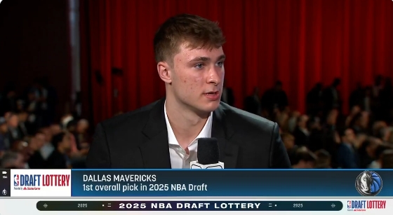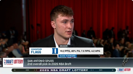 05月13日讯 NBA乐透抽签仪式今天在芝加哥进行,独行侠最终以1.8%的概率抽中了状元签。在现场观看抽签仪式的2025年状元大热弗拉格接受了节目主持团的采访。