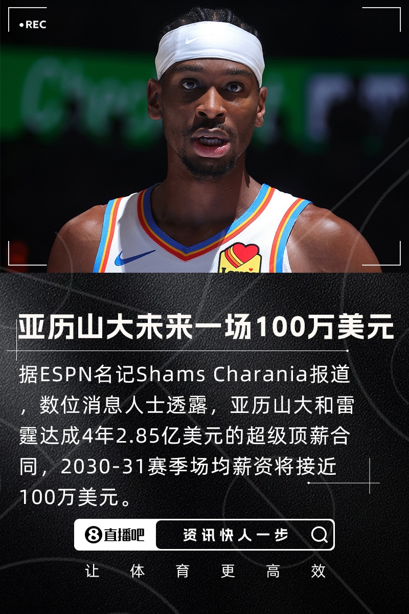 美联社资深记者Tim Reynolds感叹合同最后一个赛季的薪资:“亚历山大在2030-31赛季场均薪资将接近100万美元(常规赛,82场)。真是令人难以置信。我们知道这只是计算结果,但亲眼看到这个数字...真的是令人难以置信。”