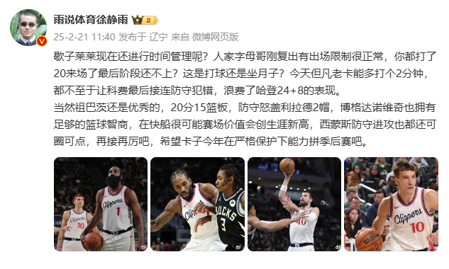 徐静雨写道:“歇子莱莱现在还进行时间管理呢?人家字母哥刚复出有出场限制很正常,你都打了20来场了最后阶段还不上?这是打球还是坐月子?今天但凡老卡能多打个2分钟,都不至于让科菲最后接连防守犯错,浪费了哈登24+8的表现。