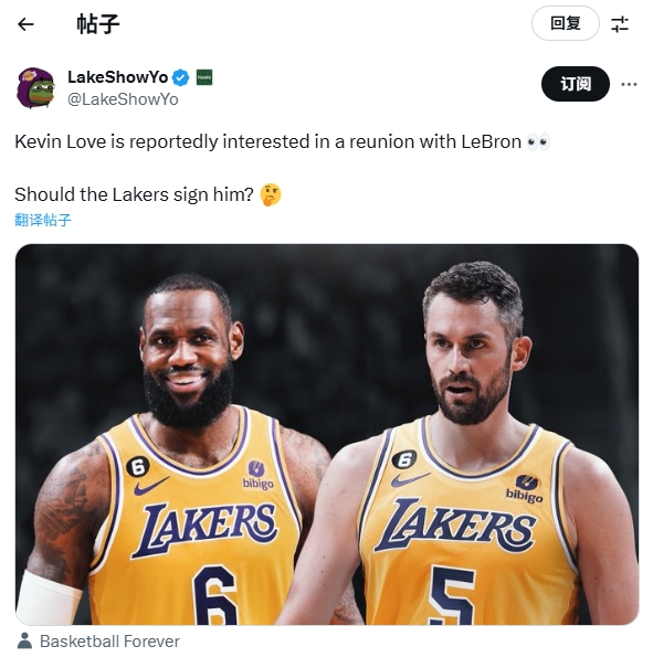 08月06日讯 湖人媒体LakeShowYo更新动态,晒出詹姆斯和乐福的湖人合成图,并写道: