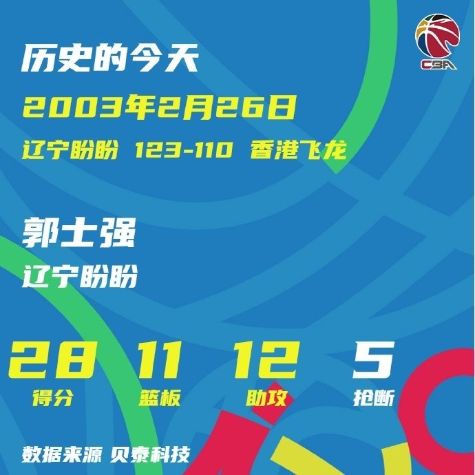 2月26日讯 2003年的今天,郭士强成为辽宁男篮队史首位斩获20+三双的球员 。