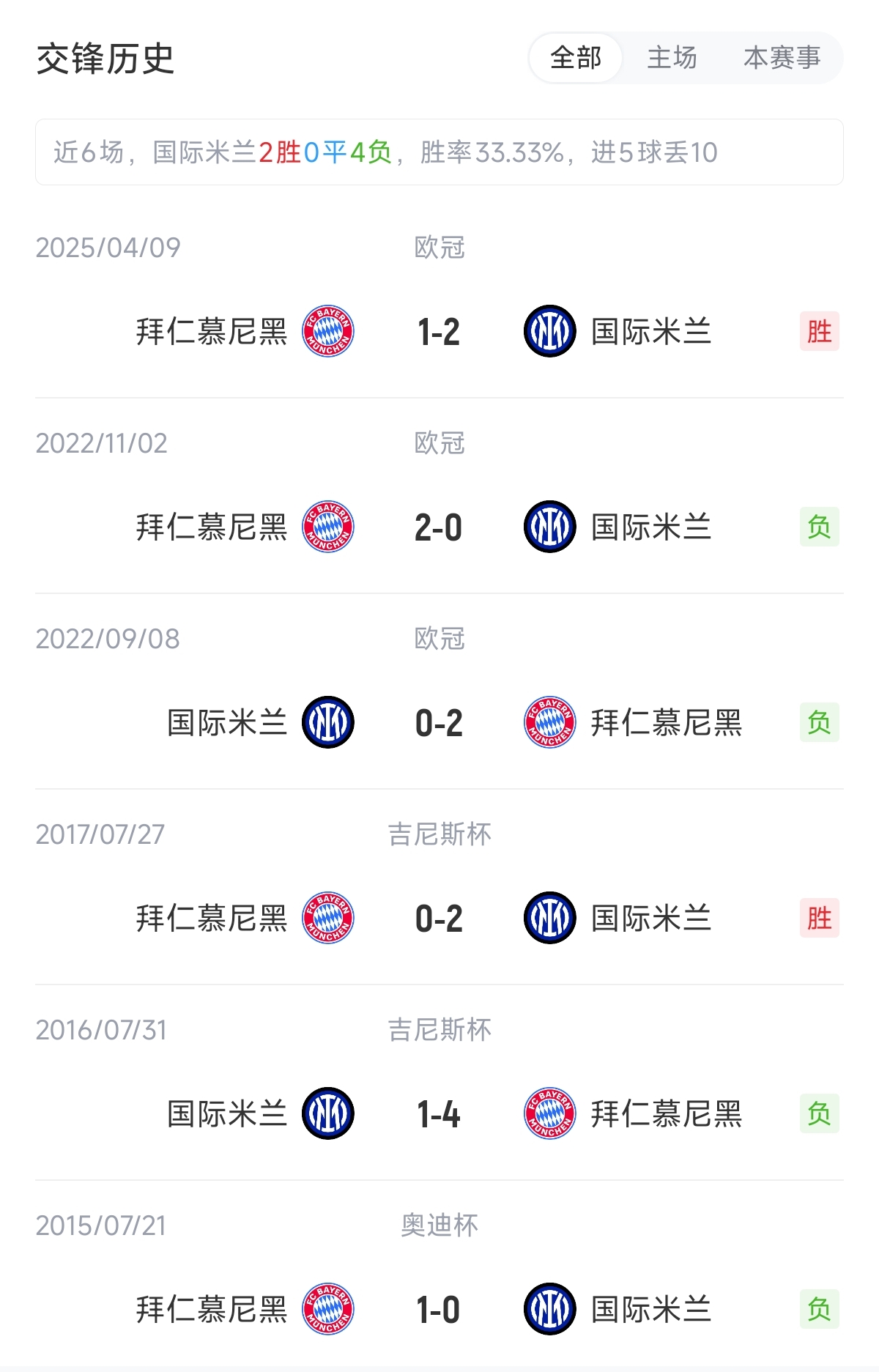 历史上两队在欧战共10次交手,国米战绩为4胜1平5负。