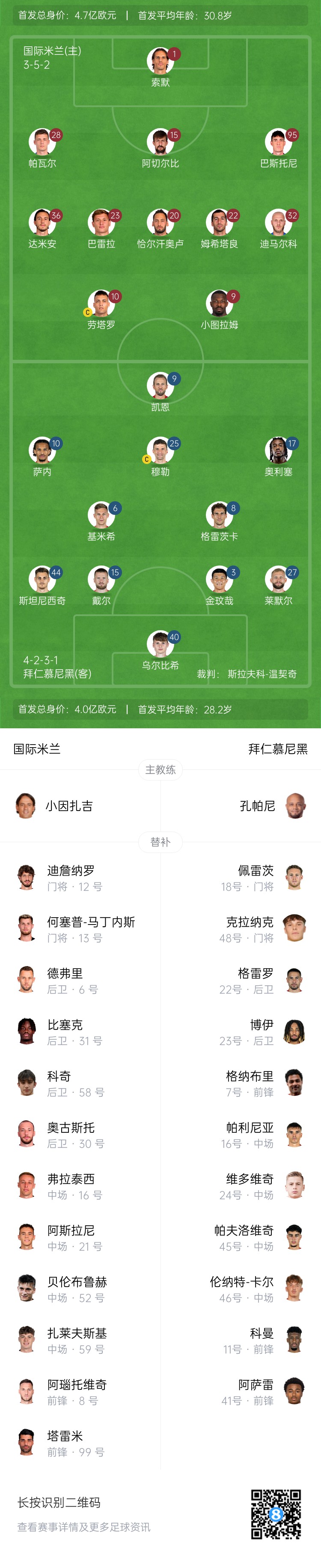 国米vs拜仁首发:劳塔罗PK凯恩,图拉姆、恰20先发,穆勒出战