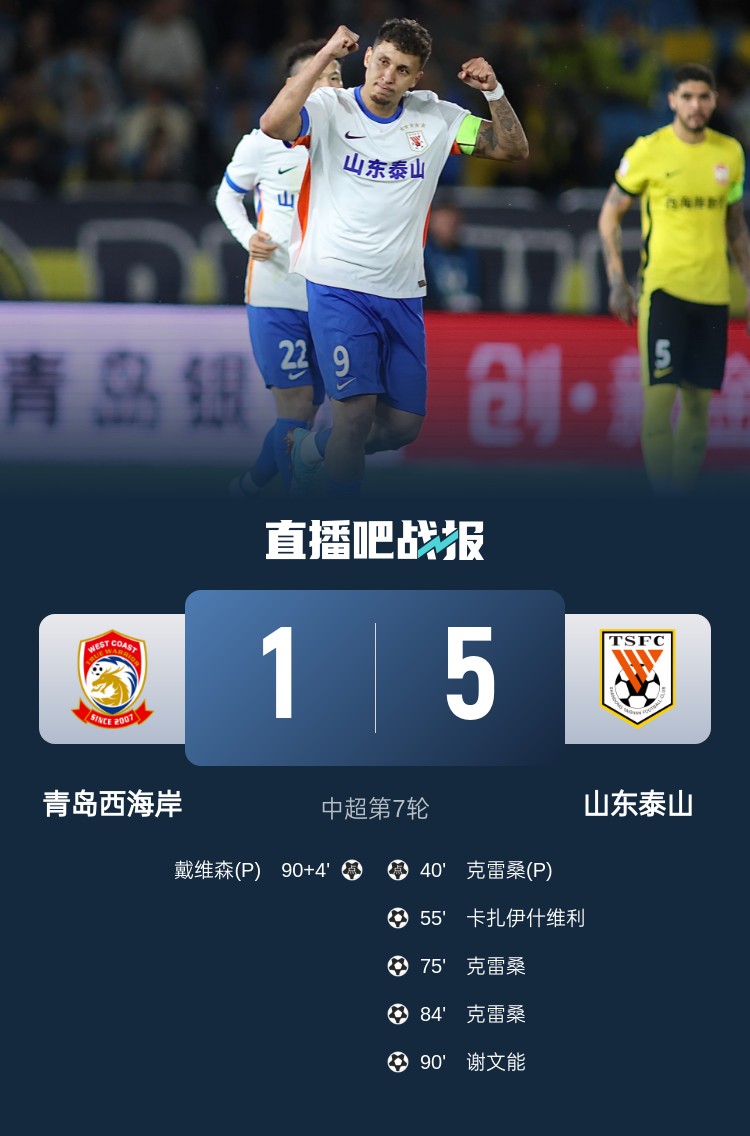 4月15日讯 北京时间4月15日晚上18:30,中超第7轮,青岛西海岸坐镇西海岸大学城体育场迎战山东泰山。上半场,阿齐兹失单刀,克雷桑造点并主罚命中。下半场,卡扎伊什维利推空门,卡扎伊什维利助攻克雷桑双响,克雷桑单刀戴帽,谢文能冷静闪开防守破门,戴维森造点并命中。全场结束,山东泰山5-1大胜青岛西海岸。本场过后,山东泰山积16分暂时以2分优势力压申花登顶;青岛西海岸吃到联赛首败,目前他们积9分排名第七。