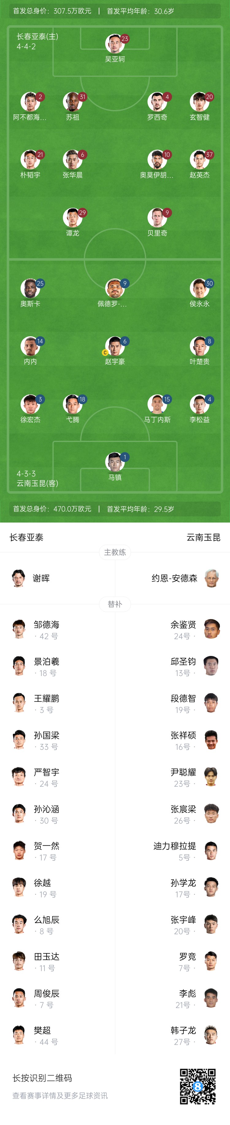 长春亚泰替补:42-邹德海、3-王耀鹏、17-贺一然、18-景泊羲、24-严智宇、30-孙沁涵、33-孙国梁、8-么旭辰、19-徐越、7-周俊辰、11-田玉达、44-樊超