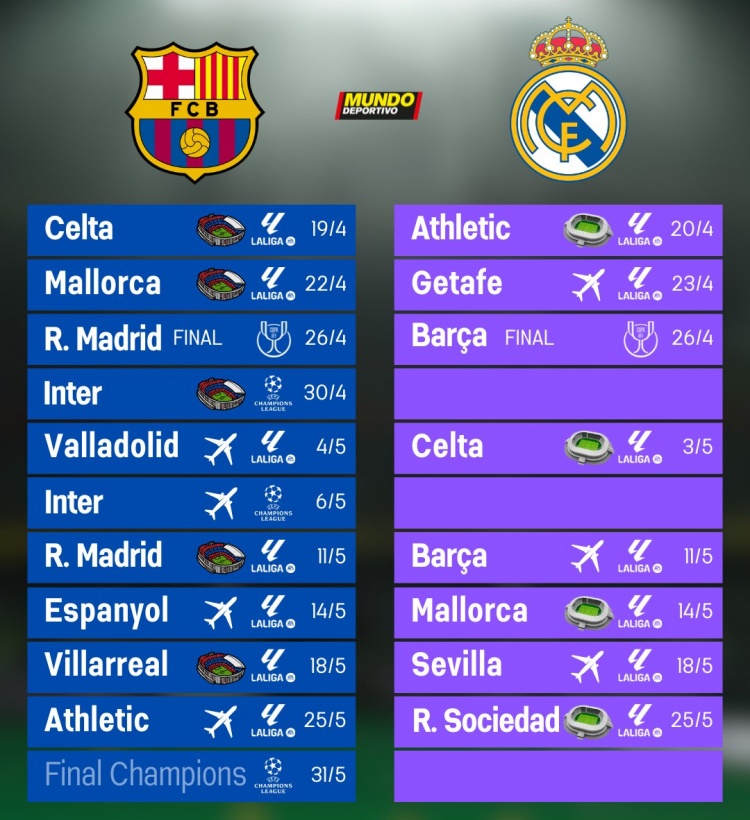 4月17日讯 西班牙媒体《世界体育报》更新社媒动态,晒出巴萨和皇马本赛季剩余赛程。
