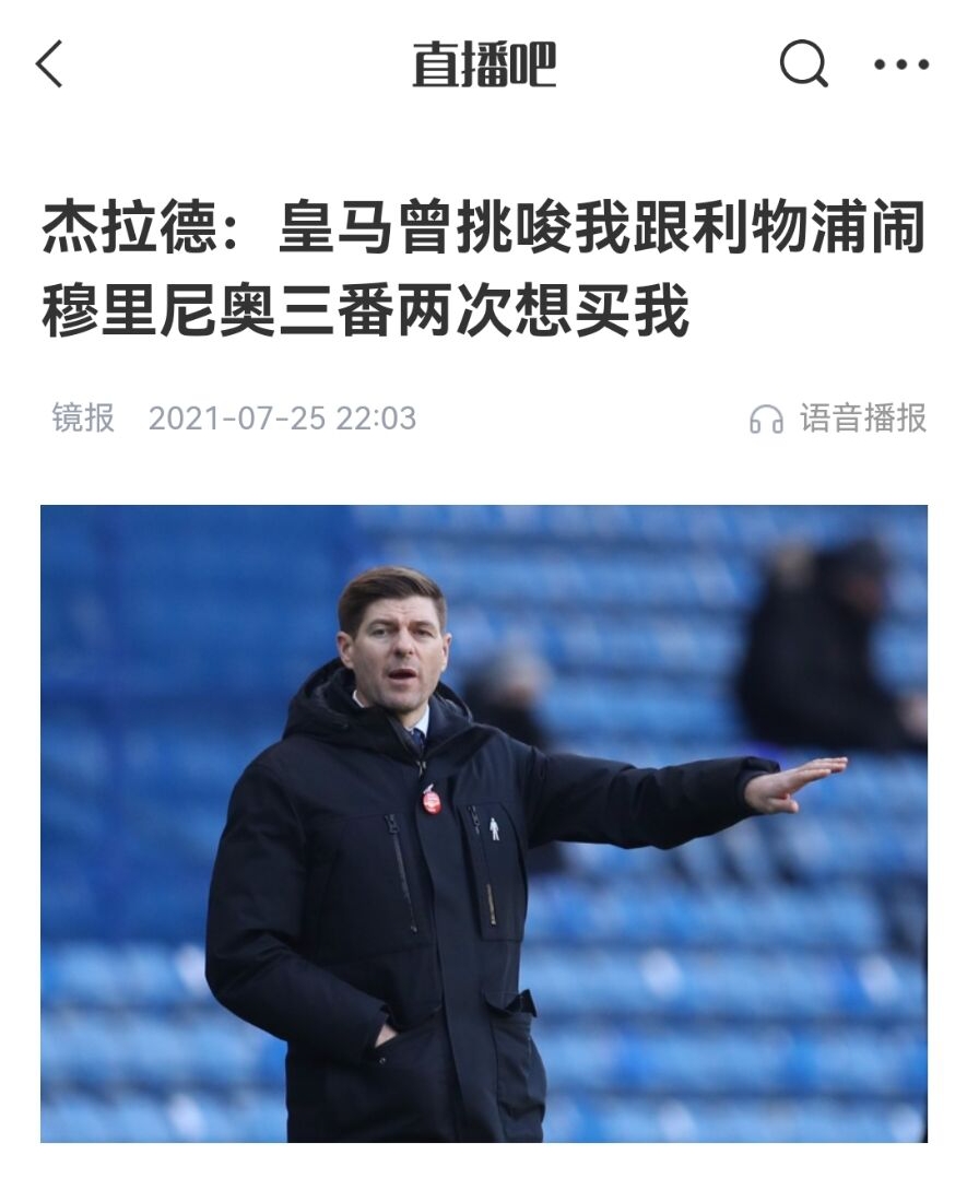 在2021年,杰拉德接受采访时透露自己屡次被穆帅邀请,杰拉德:“我想,切尔西当年那些流言不算数的话,穆里尼奥来找我是在2010年左右。也许现在当你回过头来,会想:想象一下为皇马踢上一两年的球,想象一下在欧冠联赛里作为穆里尼奥的球员上场——那将是多么难以置信的经历!你当然会这样去想,但现实中这并没有发生。”