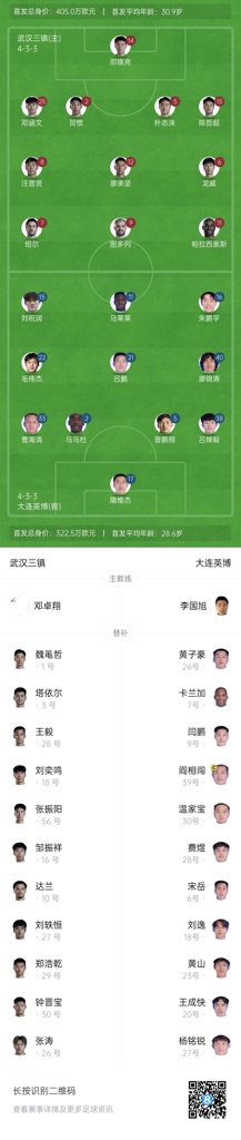05月11日讯 北京时间19:35,中超第12轮,武汉三镇vs大连英博。赛前,双方首发出炉。