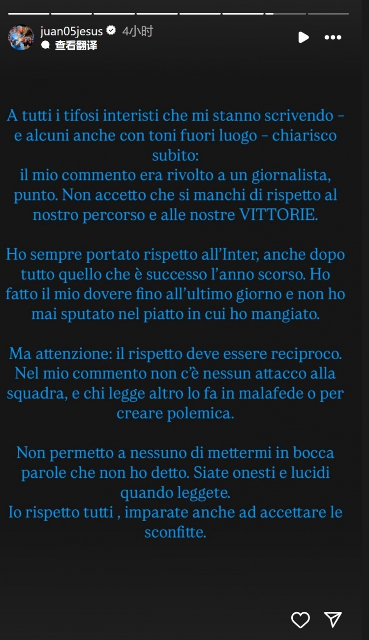 胡安-热苏斯写道:“致所有给我留言的国米球迷,包括一些言辞不当的球迷——我想要立即澄清。我的评论是针对一名记者,仅此而已。我不接受任何人对我们的历程和胜利缺乏尊重。