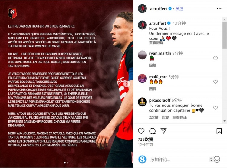 特鲁弗特在告别信中写道:“有些篇章在翻过去时充满情感,心头紧缩,但又满怀感恩。今天就是这样的情况。在雷恩度过了十年之后,我即将翻过人生中重要的一页。