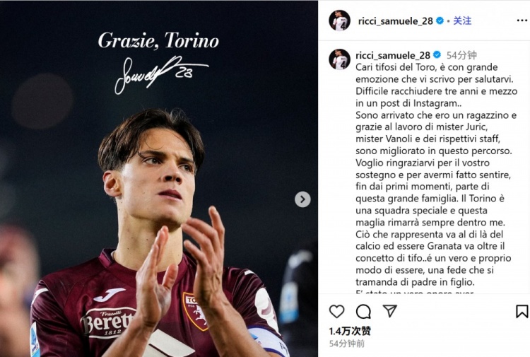 7月5日讯 米兰已经官宣签下23岁中场里奇,后者也通过社媒撰文告别都灵: