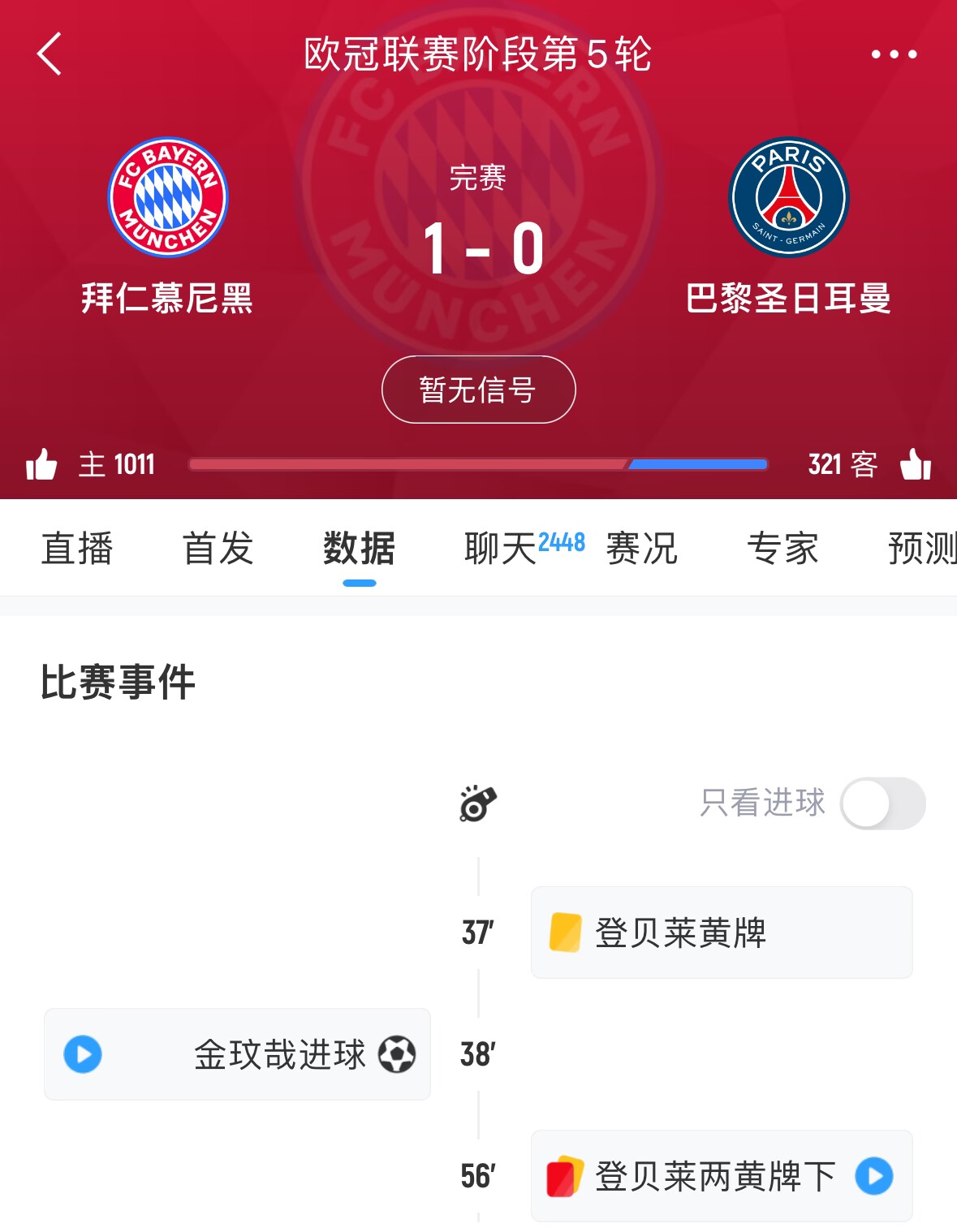 在去年11月的欧冠联赛阶段比赛中,拜仁1-0击败巴黎圣日耳曼,那场比赛登贝莱两黄变一红被罚下。