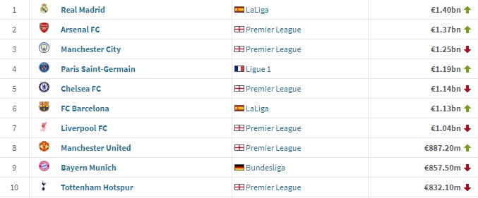 2、阿森纳 13.7亿欧元