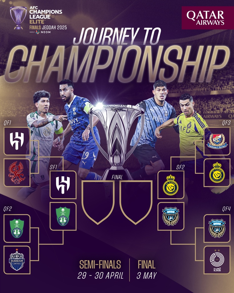 亚冠精英联赛从1/4决赛起直到决赛,为集中赛会制的单场淘汰赛,半决赛于4月29日和30日在沙特举行,决赛将于5月3日在沙特城市吉达的阿卜杜拉国王体育城体育场举行。本届亚冠精英联赛的冠军将获得至少1200万美元的奖金,其中包括参赛奖金、晋级奖金和1000万的冠军奖金。